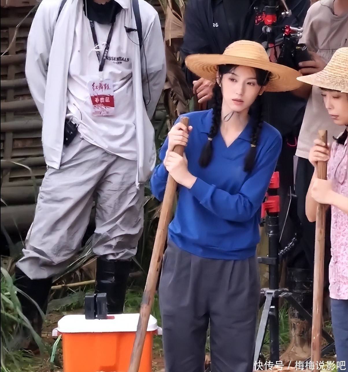 为新剧努力前几天网上传出了周女士的新剧路透,照片中她扎着双麻花辫头戴草帽,身穿蓝色上衣。